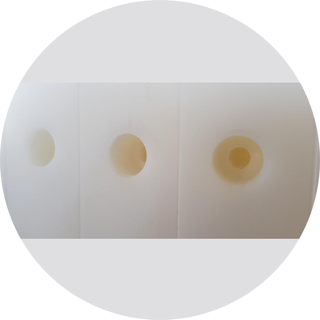 The side water drain hole it usually is supplied together with a plastic tube in the shape of an “L” (optional) that can be inserted into the 3/4 “hole, made at the bottom in the thickness of the plate, thus allowing the collection of the residual water in a water recovery channel that must be installed on the filter press. The inside water drainage are instead positioned in the plate, in the four corners and are ø 40 mm holes (ø 50 mm in the case of the 1000 x 1000 mm format) which allow the residual water to be conveyed up to the filter press head and then to be recovered.